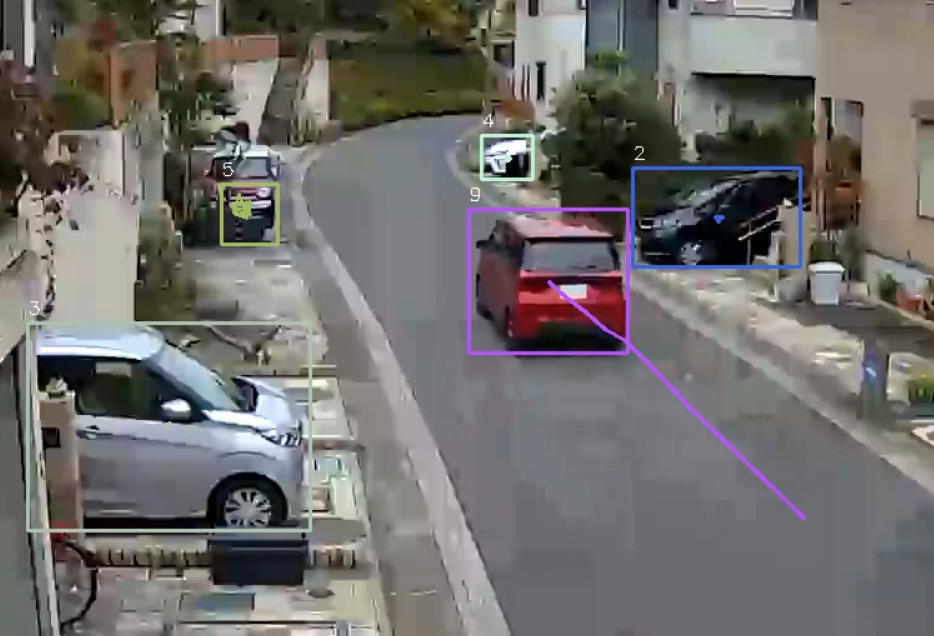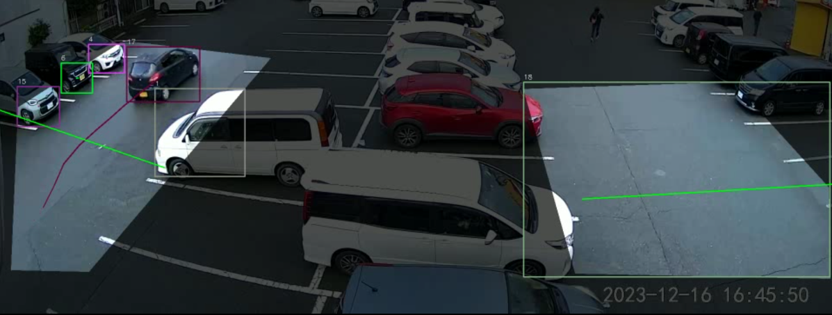 駐車場出入口等にカメラを設置、AI処理を通じ、検知ラインを跨いだ車両数を方向別に数えます。来車数カウント、回遊分析等にご利用いただけます。車番認識・車種分類機能の追加も可能です。